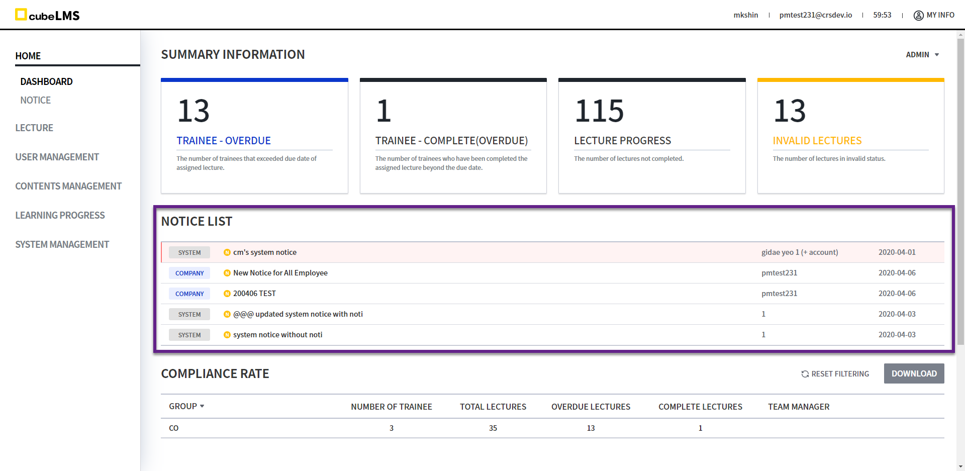- DASHBOARD에서 최근에 생성된 NOTICE 확인 가능