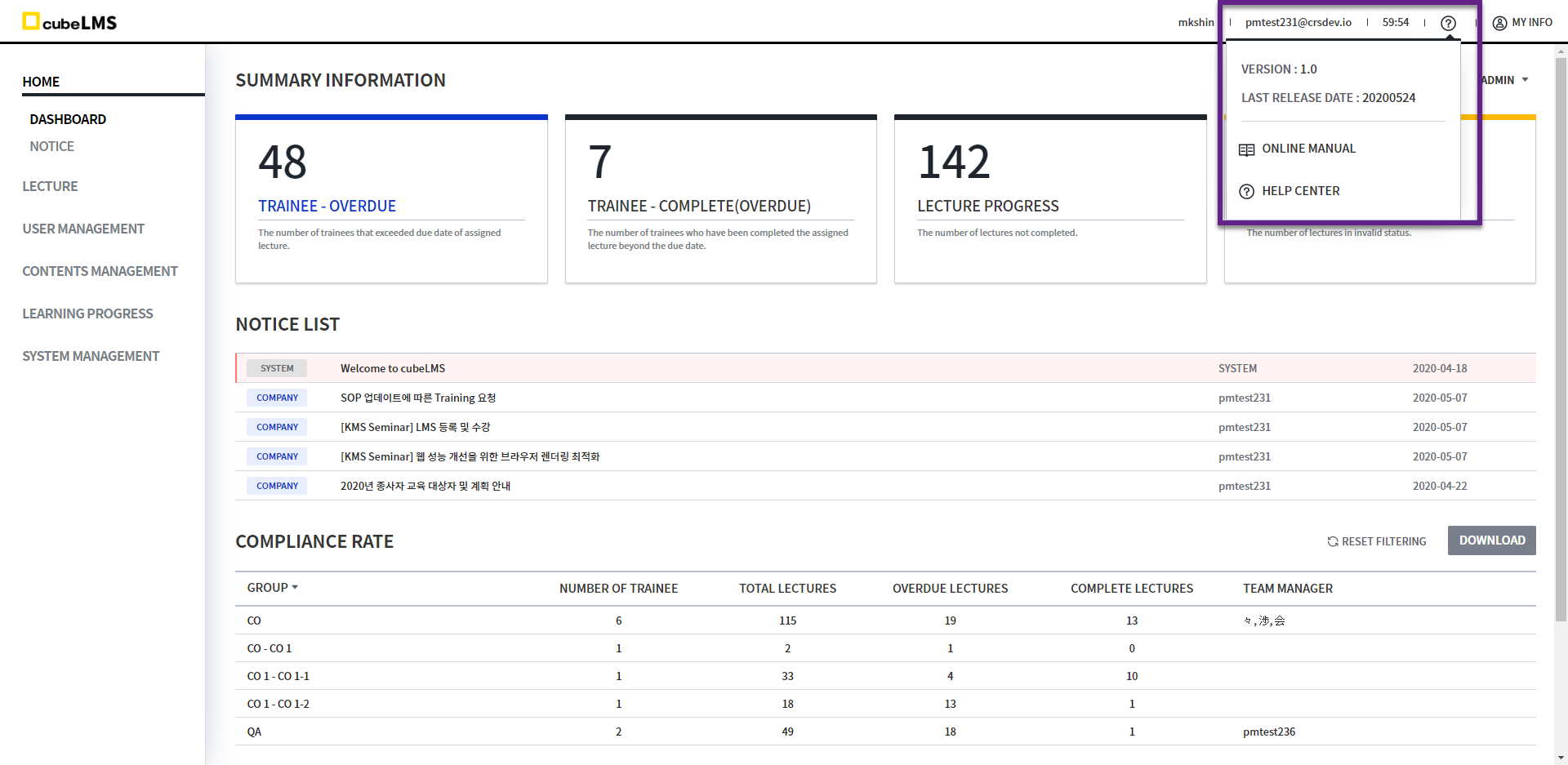 ONLINE MANUAL : ONLINE MANUAL 버튼을 클릭하면, cubeLMS의 eManual 페이지로 이동되어 매뉴얼을 확인할 수 있습니다.
