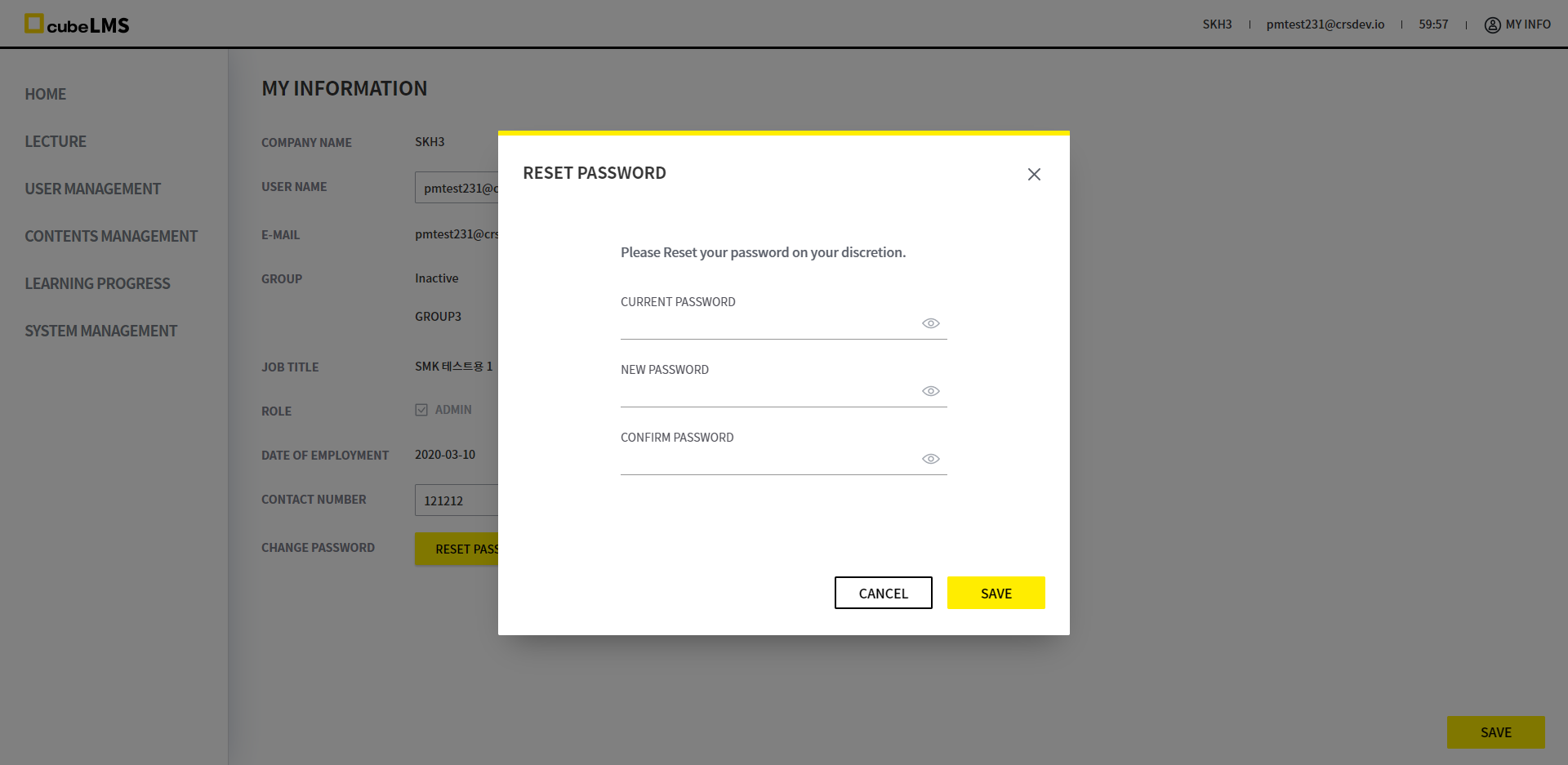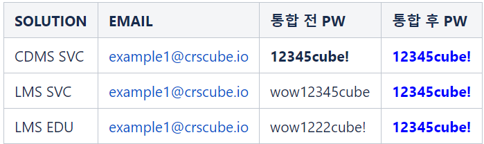 - cubeCDMS SVC, cubeLMS SVC & EDU에 등록된 USER : cubeCDMS SVC에 설정된 비밀번호 기준으로 변경됩니다.