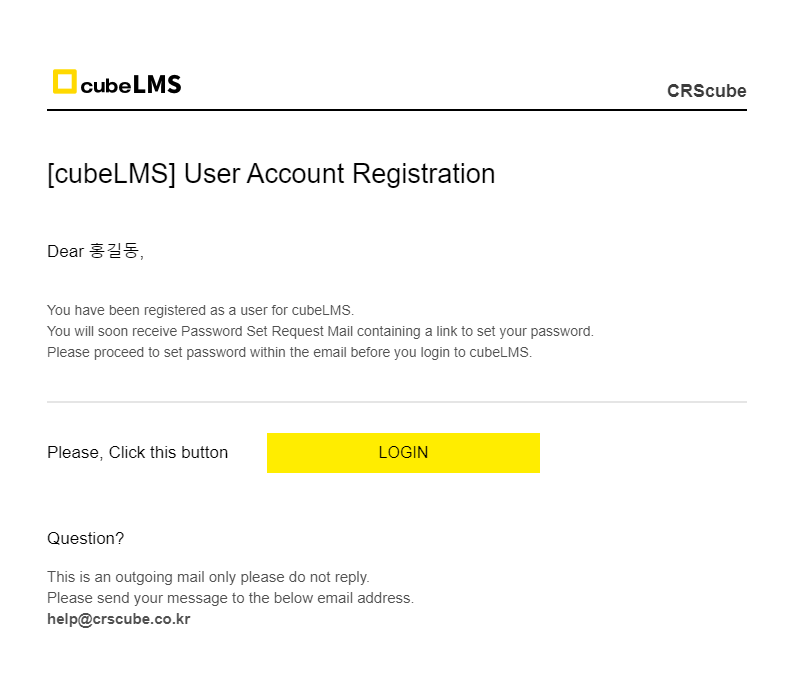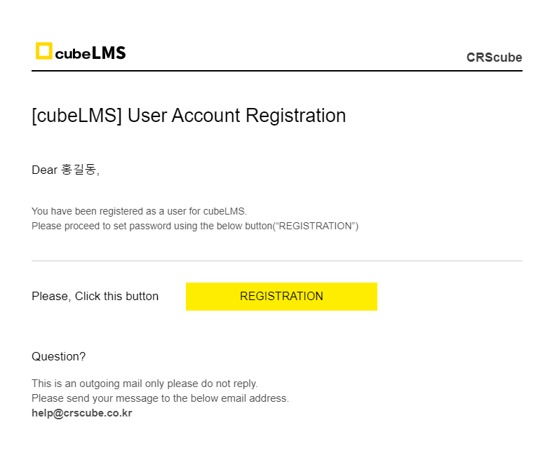 기존에는 cubeLMS에 등록되는 USER는 USER ACCOUNT REGISTRATION MAIL을 발송받고, MAIL 본문의 REGISTRATION 버튼을 눌러 비밀번호 설정을 완료했습니다.