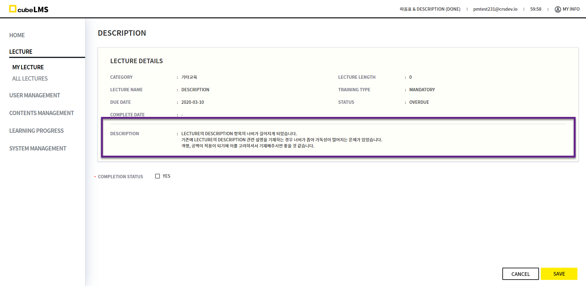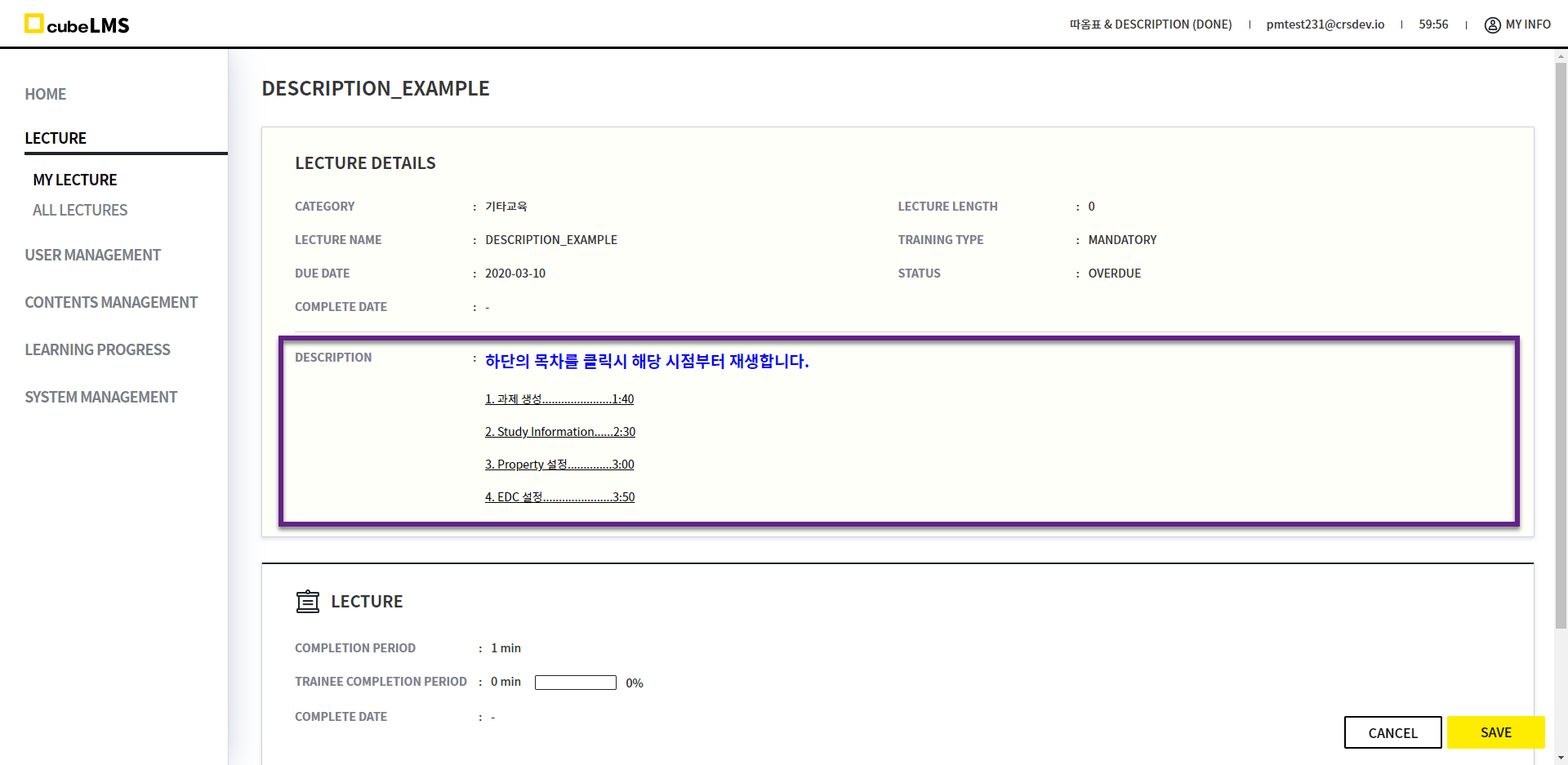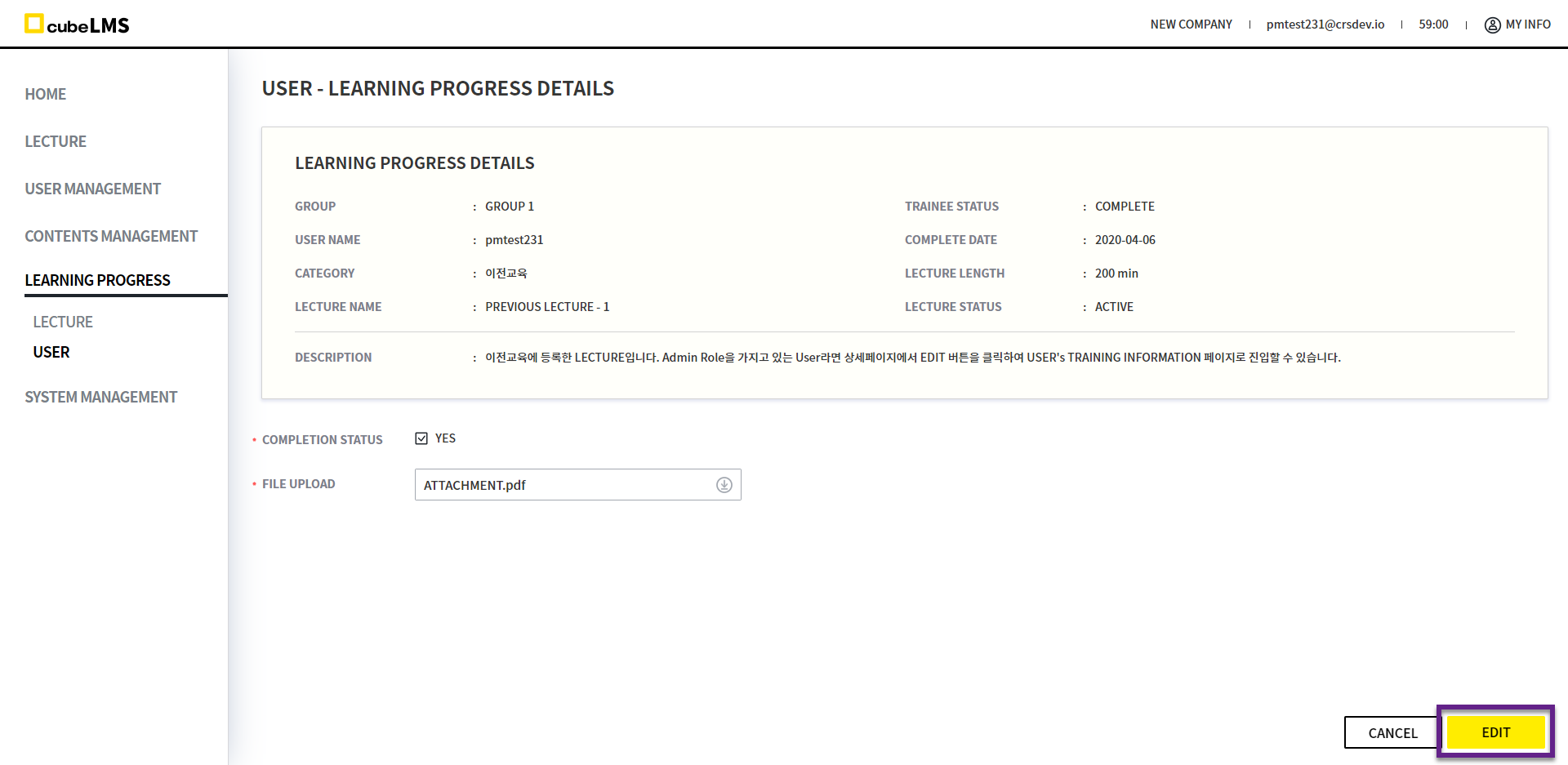 4월 정기 이관으로 ADMIN Role을 가지고 있는 USER가 LEARNING PROGRESS 메뉴에서 이전교육 LECTURE의 DETAILS로 진입하면, 우측 하단에 EDIT 버튼이 노출되게끔 변경되었습니다.